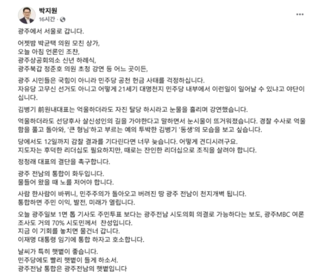 ¹ÚÁö¿ø ÀÇ¿øÀº ¾îÁ¦(6ÀÏ) ÀÚ½ÅÀÇ SNS¿¡ "±¤ÁֽùεéÀº ±¹¹ÎÀÇÈûÀÌ ¾Æ´Ï¶ó ¹ÎÁÖ´ç °øÃµ Çå±Ý »çŸ¦ °ÆÁ¤ÇÑ´Ù"¸ç "ÀÚÀ¯´ç °í¹«½Å ¼±°Åµµ ¾Æ´Ï°í, ¾î¶»°Ô 21¼¼±â ´ë¸íõÁö ¹ÎÁÖ´ç ³»ºÎ¿¡¼ ÀÌ·± ÀÏÀÌ ÀϾ ¼ö ÀÖ³Ä°í ¾ß´Ü"À̶ó¸ç,