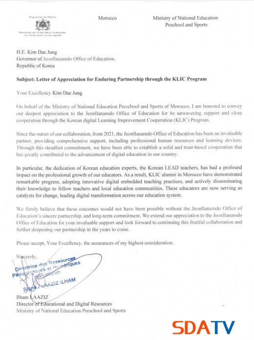 À̹ø °¨»ç ¼ÇÑÀº Àü¶ó³²µµ±³À°Ã»ÀÌ 2021³âºÎÅÍ ±³À° Á¤º¸È Áö¿ø »ç¾÷ (KLIC‧Korean Digital-Learning Improvement Cooperation)À» ÅëÇØ ¸ð·ÎÄÚ ±³À°ºÎ¿Í µðÁöÅÐ ±³À° ºÐ¾ß¿¡¼ Áö¼ÓÀûÀÎ Çù·ÂÀ» À̾î¿Â µ¥ ´ëÇÑ Æò°¡¸¦ ´ã°í ÀÖ´Ù. ¸ð·ÎÄÚ ±³À°ºÎ´Â ¼ÇÑÀ» ÅëÇØ Àü³²±³À°Ã»ÀÌ ´Ü±âÀû Áö¿øÀ» ³Ñ¾î Àå±âÀû °üÁ¡¿¡¼ Çù·ÂÀ» À̾î¿Â Á¡¿¡ ±íÀº °¨»ç¸¦ Ç¥Çß´Ù.