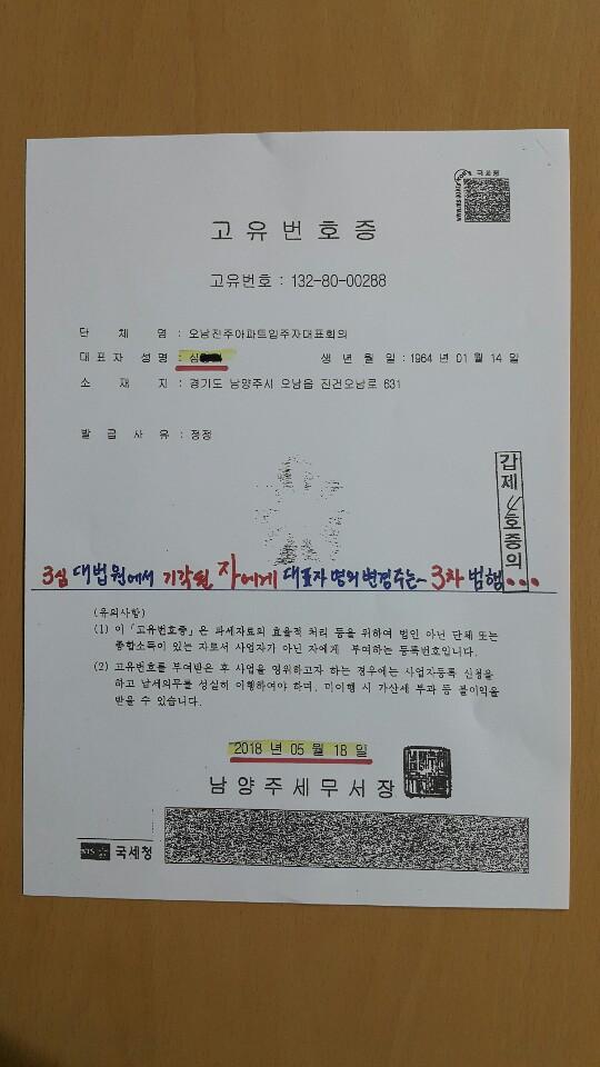 ±×·±µ¥ ÇØ´ç ¼¼¹«¼°¡ 2014³â Àå ¸ð¾¾¿¡°Ô 1328290334¶ó´Â °íÀ¯¹øÈ£¸¦ ¶Ç ¹ß±ÞÇÏ´Â Èñ¾ÈÇÑ ÀÏÀÌ ¹ú¾îÁø °ÍÀÌ´Ù. ÀÌ¿¡ ÁֹεéÀÌ Ç×ÀÇÇÏÀÚ Àå ¸ð ¾¾ÀÇ ¹øÈ£¸¦ ¾ø¾Ö°í ÁøÁ¤ ´ëÇ¥ÀÎ ¾Èµµ¼± ¾¾ÀÇ ¹øÈ£¸¦ ÀÎÁ¤ÇÏÁö ¾ÊÀ¸¸ç ½É ¸ð¾¾¶ó´Â »ç¶÷¿¡°Ô °íÀ¯¹øÈ£¸¦ ¹ß±ÞÇß´Ù. ÀÌ¿¡ Áֹεé°ú ¾È¾¾°¡ Ç×ÀÇÇÏ°í ¼Ò¼ÛÀ¸·Î ¹ßÀüµÆ´Ù. °á±¹ ´ë¹ý¿øÀº ½É ¸ð¾¾ÀÇ »ó°í¸¦ ±â°¢ÇÏ°í ¾Èµµ¼± ¾¾¸¦ ÀÎÁ¤ÇÏ´Â ÆÇ°áÀ» ³»·È´Ù.