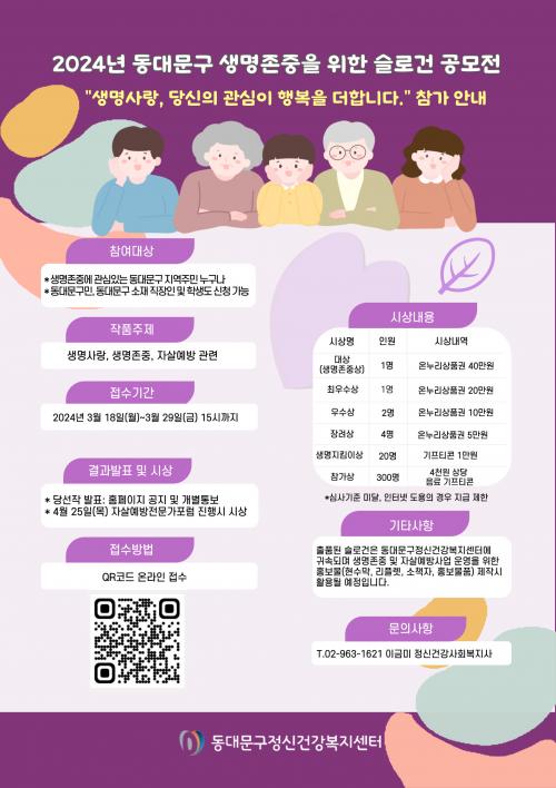Á¢¼ö ±â°£Àº 3¿ù 29ÀϱîÁö·Î, µ¿´ë¹®±¸Á¤½Å°Ç°º¹Áö¼¾ÅÍ ´©¸®ÁýÀ̳ª Æ÷½ºÅÍ¿¡ °Ô½ÃµÈ QRÄÚµå·Î Á¢¼öÇÏ¸é µÈ´Ù.